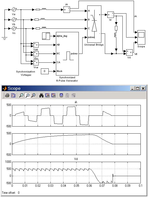 На рис. 1.66 показана схема трехфазного тиристорного выпрямителя, работающего на активно-индуктивную нагрузку. В момент времени равный 0,06 с выполняется перевод выпрямителя в инверторный режим. На графиках хорошо видно, что выходное напряжение выпрямителя при этом меняет знак.