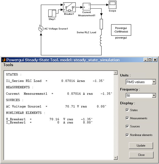 Режим Steady-State позволяет выполнить расчет схемы на постоянном токе. Расчет производится для состояния схемы в момент времени t =0. В этом режиме расчета в окне блока Powergui отображаются значения переменных состояния модели, а также измеряемых переменных источников и нелинейных элементов. Расчет проводится для одной фиксированной частоты равной частоте источников схемы, либо для нулевой частоты, если в схеме присутствуют только источники постоянного напряжения. Результаты могут быть представлены как в виде действующих, так и в виде амплитудных значений. При расчете на переменном напряжении будут показаны также фазовые сдвиги соответствующих переменных. При наличии в схеме ключевых элементов следует иметь в виду, что расчет будет выполнен для начального состояния ключей.