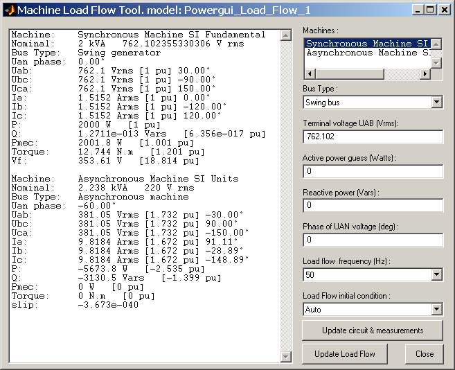После нажатия кнопки Update Load Flow произойдет автоматическая запись рассчитанных начальных условий в параметры блоков электрических машин. Кроме того, если потребуются изменения и во входных сигналах блоков (момент нагрузки, входная мощность и т.п.), то будут выведены сообщения с нужными значениями. Эти значения необходимо задать с помощью блоков IC.