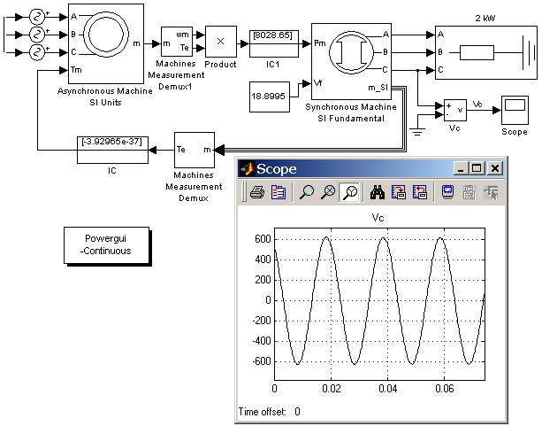 На рис. 2.5 показана схема, в которой синхронный генератор, работающий на активную нагрузку, приводится во вращение асинхронным двигателем. На осциллограмме показано напряжение фазы C генератора. Как видно на осциллограмме, начальное значение напряжения не равно нулю, как это имело бы место при нулевых начальных условиях.