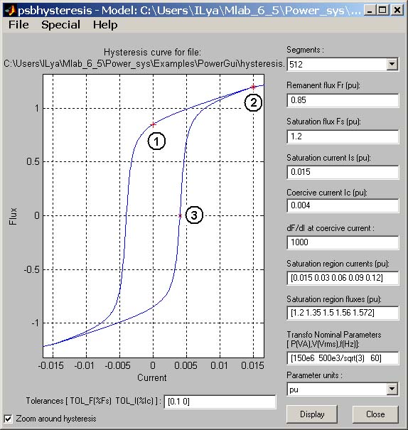 Для запуска инструмента необходимо нажать кнопку Hysteresis Design Tool в окне Powergui. В открывшемся окне (рис. 2.11) необходимо задать следующие параметры: