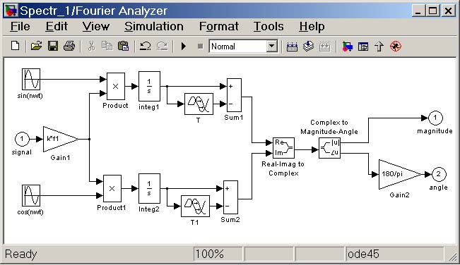 Для устранения этого недостатка можно модернизировать блок Fourier таким образом, чтобы в окне параметров задавать диапазон или вектор номеров гармоник, а на выходах иметь векторы амплитуд и фаз сигналов. Для модернизации блока необходимо сначала разорвать связь блока с библиотекой. Для этого требуется выделить блок и выполнить последовательность команд меню Edit/Link options/disable Link. После этого можно открыть блок командой Edit/Look under musk и приступить к редактированию. Новая схема блока показана на рис. 6.