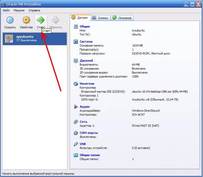 Virtualboxи нажимаем кнопочку Старт. Виртуальный компьютер начинает свою работу.