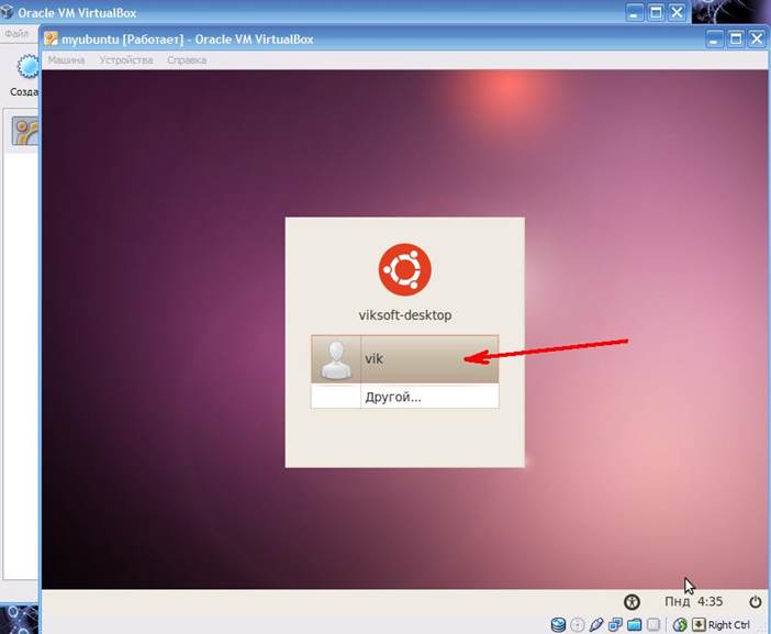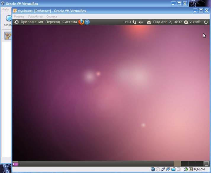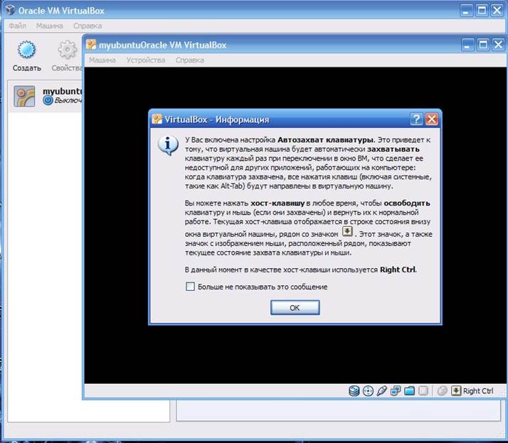 Появляется окно которое предупреждает нас о захвате клавиатуры виртуальной машиной, кнопка ПРАВЫЙ CTRL забирает клавиатуру и мышь обратно. Всё очень просто клавиатура и мышь одна а компьютера два один настоящий другой виртуальный, поэтому они используют мышь и клавиатуру по очереди а ПРАВЫЙ CTRL это переключатель. Если вы все запомнили то можно установить галочку на сообщении «Больше не показывать это сообщение» и нажать ОК.