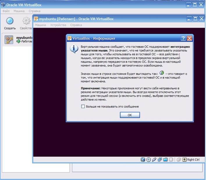 Вот и второе предупреждение оно говорит нам, что мышка автоматически интегрируется в виртуальную машину. То есть нам не нужно думать в каком она сейчас окне для нас все прозрачно. Если вы все запомнили то можно установить галочку на сообщении «Больше не показывать это сообщение» и нажать ОК.