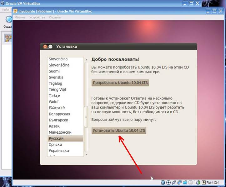 Наконец то мы видим пригласительный экран Ubuntu. Выбираем Русский язык или какой вам удобней и нажимаем кнопку Установить Ubuntu 10.04 LTS. Кстати (LTS) версия означает, что вы получаете 3 года поддержки на Ubuntu Desktop.