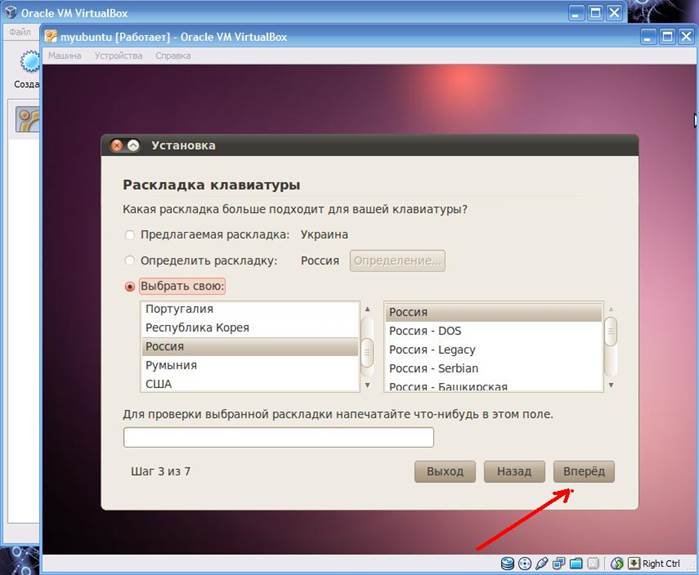 Теперь нужно выбрать раскладку клавиатуры я чаще пользуюсь русской поэтому выбираю её и жму Вперед.