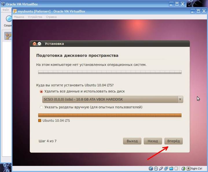 Здесь мы видим наш подготовленный виртуальный жесткий диск объёмом 10 Гигабайт жмём Вперед.