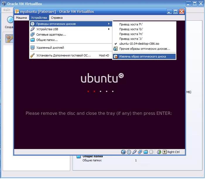 После перезагрузки Система просит нас извлечь инсталляционный диск в нашем случае cd-образ. нажимаем мышкой как показано ниже, и начнётся загрузка с жесткого диска.