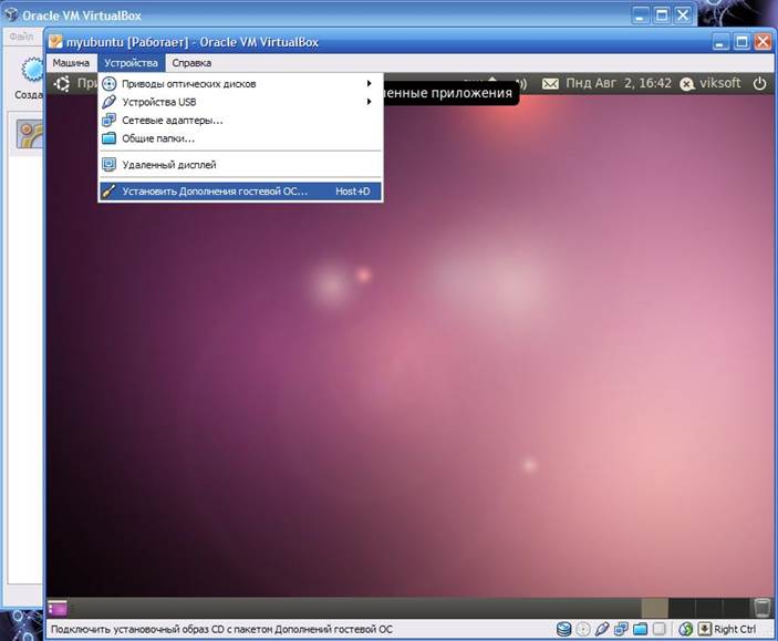 После перезагрузки вы наверное заметили, что разрешение монитора слишком маленькое нам необходимо установить дополнения для гостевой операционной системы. Тогда Virtualbox лучше подстроится под установленную операционную систему(Windows, Linux или любую другую). Нажимаем Устройства -> Установить Дополнения гостевой ОС.