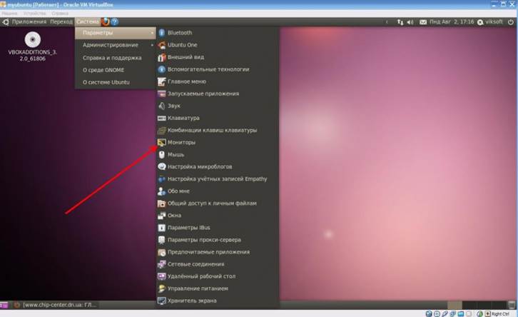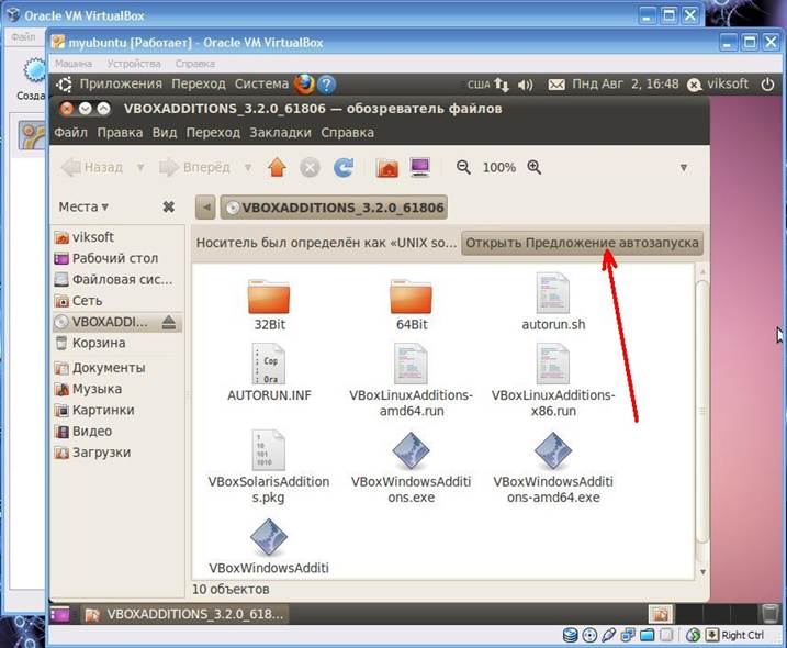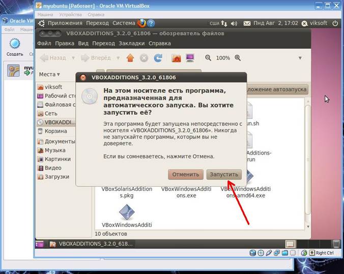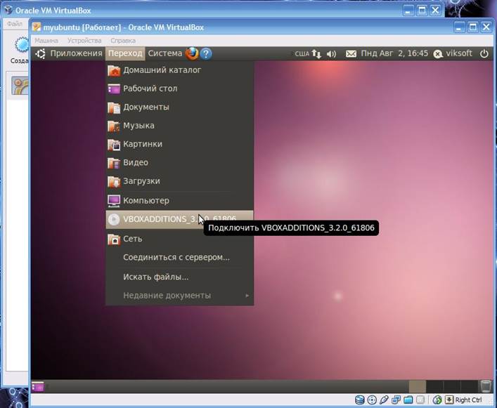 Далее нажимаем Переход-> подключить VBOXADDITIONS_3.2.0_61806