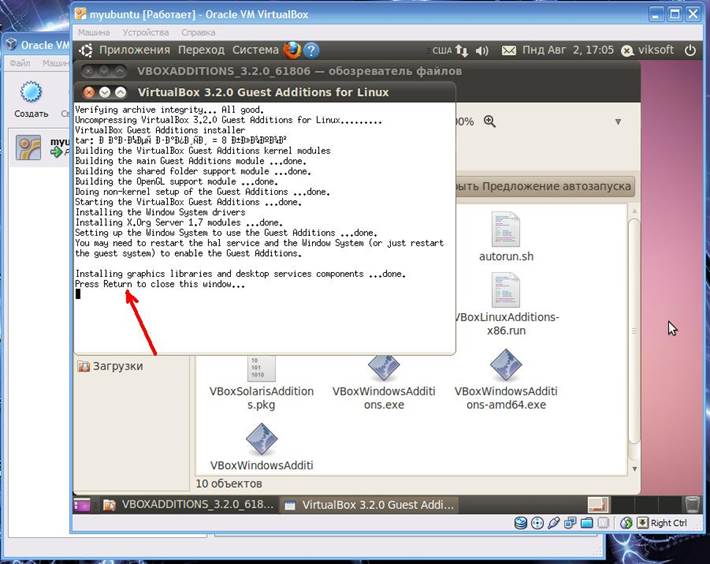 У вас должно появится вот такое окно терминала где происходит установка дополнений ОС, когда появится последняя строчка указанная красной стрелкой можно нажимать кнопку Enterокошко закроется и это означает что у нас все готово для дальнейшей работы.