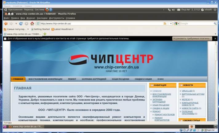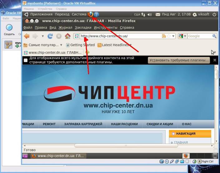 Если у вас есть подключение к интернет, то оно уже должно работать и в виртуальной машине. Для проверки запустим броузер Firefox и в адресной строке введем какой нибудь сайт, страница должна загружаться. Но как видите разрешение экрана маленькое перейдем к новому слайду.