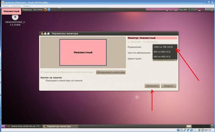 Меняем разрешение на нужное вам, у меня это 1360х768 у вас может быть другое все зависит от вашего настоящего монитора. И жмем кнопочку Применить.