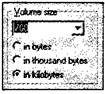 дискет можно выбрать с помощью раскрывающей кнопки. Но размер тома может быть и произвольным — в этом случае его можно вручную ввести в поле. При ручном вводе необходимо предварительно выставить единицу измерения: в байтах (in bytes), в тысячах байтов (in thousand bytes) и в килобайтах tin kilobytes).