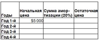 По данным таблицы следует рассчитать остаточную цену автомобиля в конце четвертого года эксплуатации. Исходными данными для расчета являются: цена автомобиля и коэффициент амортизации 20% – занесите в отдельную ячейку. Сделайте необходимые расчеты, оформите таблицу и сохраните ее на следующем рабочем листе. Создайте нижний колонтитул с информацией: работу выполнил ФИО, дата, время. Подготовьте документ к печати.