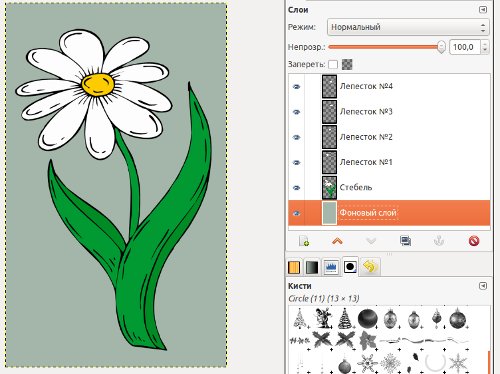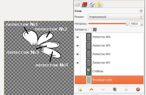 Если теперь наложить все прозрачные пленки на листок со стеблем, то у нас в итоге получится изображение цветка.
