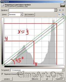 Данная линия еще прямая, так как входные уровни (исходные значения интенсивности пикселов) и выходные уровни (новые значения цветов) идентичны. То есть значения по оси X равны значениям по оси Y
