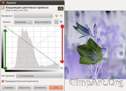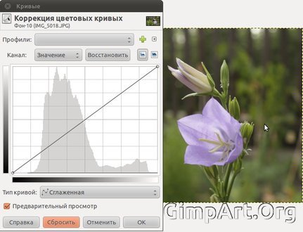 Ну что же, так воспользуемся инструментом «Кривые». Для этого идем в «Цвет – Кривые». И перед вами откроется диалоговое окно инструмента «Кривые»: