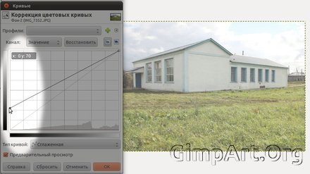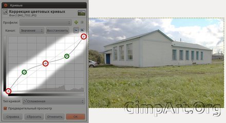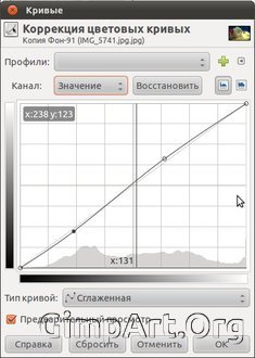 Рассмотрим это на примере. Откроем любое изображение в gimp. Далее активируем инструмент кривые через «Цвет — Кривые». Затем один раз щелкнем по центру кривой, этим мы зафиксируем любые изменения в средних значениях тона. После чего в диалоговом окне «Кривые» нажмите на диагональную линию где-то в правой стороне и перетащите ее немного вверх. Это осветлит светлые пиксели на фотографии. Затем нажмите на линии в левой области и перетащите вниз. Вы заметите, что темные пиксели на изображении потемнели.