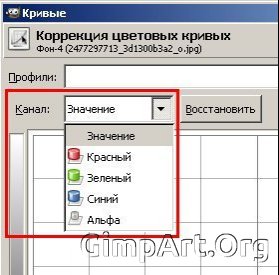 До сих пор все кривые были применены к RGB значению светимости. Но также кривые могут использоваться на отдельных цветовых каналах (Красный, Зеленый, Синий), чтобы исправить цвет в определенных тональных областях. Для выбора нужного канала необходимо нажать на следующую вкладку и из выпавшего списка выбрать нужный канал для цветокоррекции.