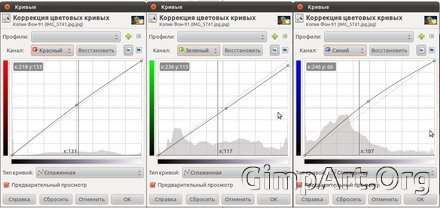 Приведем параметры кривых цветовых каналов, по коррекции этой фотографии.