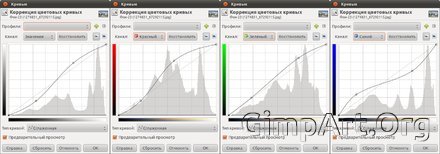 Шаг 3. Далее идем в «Цвет - Кривые». Устанавливаем кривые, как показано на скриншотах. Щелкаем по вкладке "Каналы" для выбора нужного канала ("Значение", "Красный","Зеленый","Синий") и у создаем кривые вида "S".