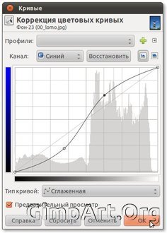 Изменение кривой в синем канале, аналогично предыдущем. Любые изменения кривой вверх приведут к увеличению синего цвета,