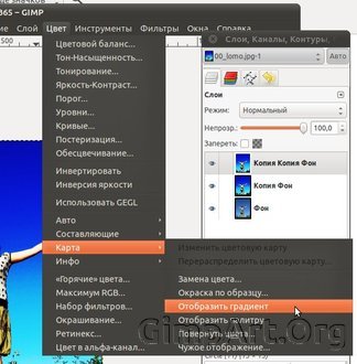 Шаг 4. Создаем копию слоя. Далее применяем "Цвет-Карта-Отобразить градиент" ( Убидиттесь, что цвет фона и переднего плана по умолчанию, т.е. Черный и белый)