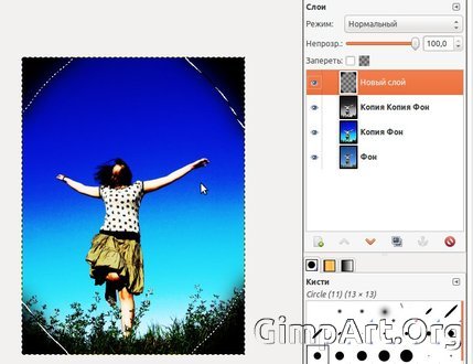 Шаг 5. Заключительным шагом в создании ломо-эффекта будет добавление эффекта виньетирования на снимок. Для этого создаем новый прозрачный слой выше всех слоев, после чего выбираем инструмент «Эллиптическое выделение» на панели инструментов и создаем выделение в форме круга, как показано на скриншоте