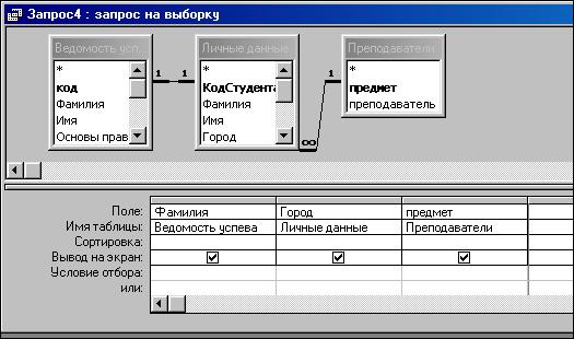 · В первую строчку <Поле> из первой таблицы перенесите в первый столбец поля <Фамилия>, во второй <Имя> и в третий <Пропуски по уважительной причине>, в четвертый столбец перетащите поле <Город> из второй таблицы и в последнем столбце будет поле <Предмет> из третьей таблицы.