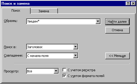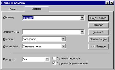 Остальные параметры диалогового окна можно изменить или оставить так, как они установлены по умолчанию. При поиске в текстовых полях целесообразно устанавливать флажок С учетом формата полей.