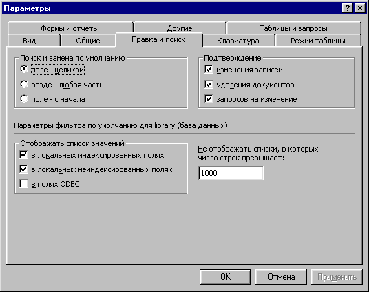 В Access есть возможность установить параметры поиска/замены по умолчанию. Для этого используется вкладка Правка и поискдиалогового окна Параметры (команда Параметры меню Сервис).
