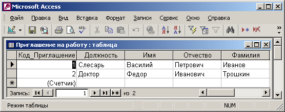 1. В окне базы данных откройте список таблиц и дважды щелкните на значке Список. Выбранная таблица откроется в режиме просмотра данных.