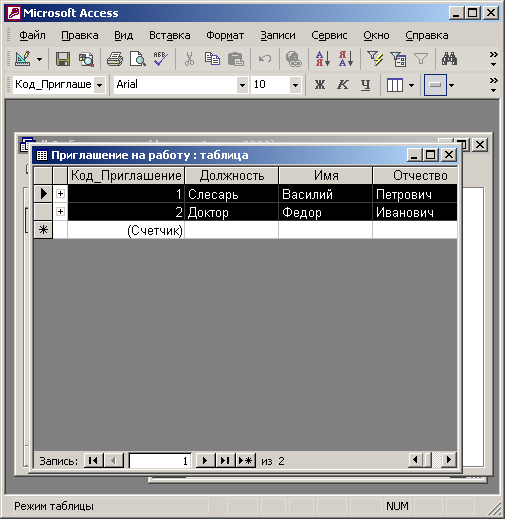 12. В окне базы данных дважды щелкните на значке таблицы Контакты. В открывшемся окне таблицы видны небольшие знаки "плюс", расположенные в левой части записей. Их присутствие говорит о наличии связи ключевого поля таблицы с другой таблицей.