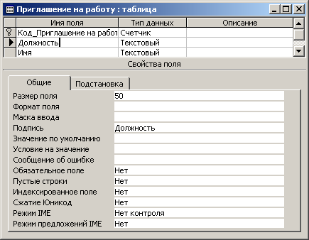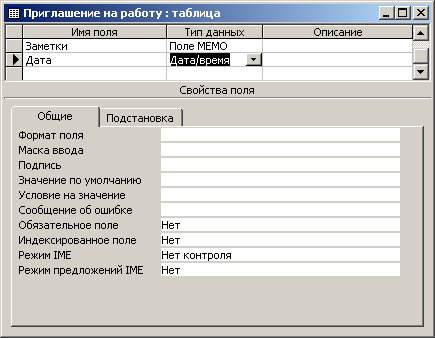 2. Описание контакта может быть достаточно длинным, а максимальная длина текстовых полей ограничена 256 символами. Поэтому измените тип поля Описание на Поле MEMO.