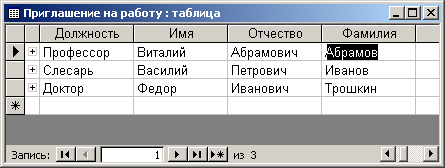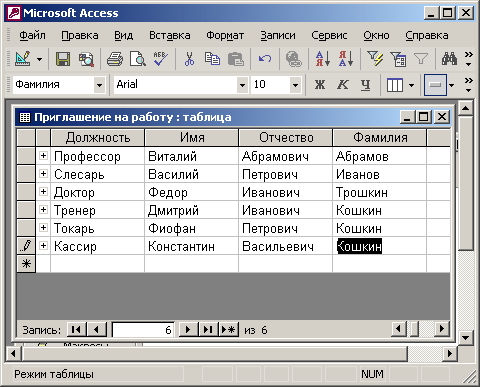 3. В окне таблицы щелкните на заголовке Фамилия, чтобы выделить столбец.