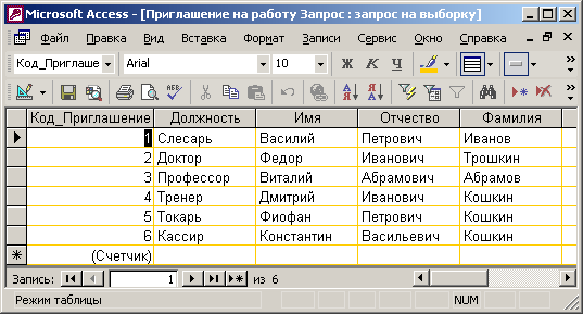 Access построит запрос и выполнит его. Запрос – это набор условий, согласно которым производится выборка информации из таблиц. Запуск запроса формирует новую таблицу данных, единственным отличием которой от обычных таблиц является то, что с помощью повторных запусков запроса ее данные можно обновлять в соответствии с изменением информации источников данных запроса.