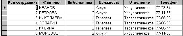 Access – является реляционной базой данных, т.е. данные хранятся в ней не в одной большой таблице, а в нескольких разных таблицах, связанных между собой таким образом, чтобы в любой момент можно было объединить или извлечь все необходимые данные из этих таблиц. Чтобы объяснить принцип действия реляционной базы данных, рассмотрим показанную на Рис.1 базу данных на основе плоского файла, которая в отличие от реляционной базы данных состоит из одной большой таблицы. В рассматриваемой базе данных перечислены фамилии и контактные телефоны специалистов терапевтического и хирургического отделений городских больниц. При такой организации базы данных каждый раз при вводе сведений о новом человеке придется полностью вводить всю относящуюся к нему информацию, причем некоторую ее часть повторно, несмотря на то, что она уже содержится в базе данных. В рассматриваемом примере повторно придется вводить название отделения и контактный телефон.