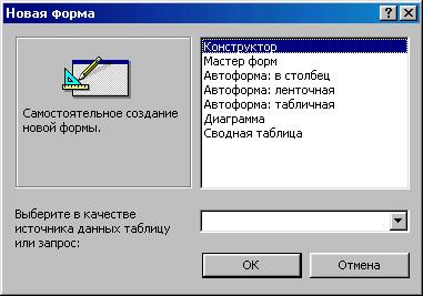 Создание формы следует начать с активизации вкладки Формы окна базы данных. Далее необходимо щелкнуть на кнопке Создать и на экране появится диалоговое окно Новая форма (Рис.9).