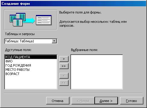 Рассмотрим подробно создание формы с помощью мастера форм:
