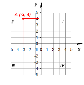 Пару чисел (x; y) называют координатами точки. Например, координаты точки А (-3; 4).