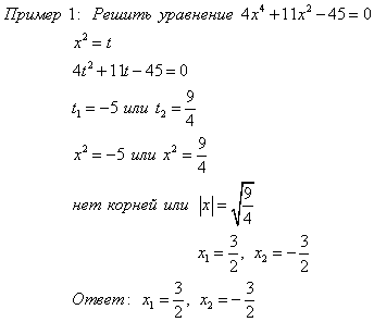 где a, b, c - числа, называется биквадратным. Решается введением замены x2=t
