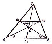Медианы треугольника пересекаются в одной точке, которая делит каждую медиану в отношении 2:1, считая от вершины.