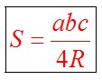 Площадь треугольника равна произведению длин его сторон, деленному на учетверенный радиус R описанной около него окружности:
