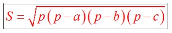 Формула Герона: если a, b, c - длины сторон треугольника, а p - его полупериметр, то площадь треугольника: