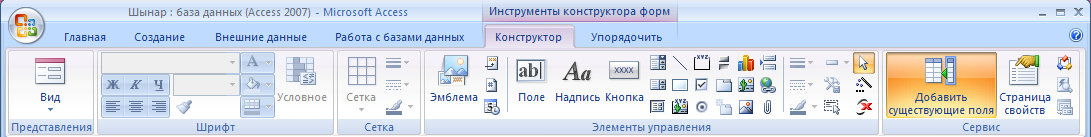В этом режиме пользователю предоставляются практически неограниченные возможности по созданию форм. После перехода в режим конструктора форм отображается вкладка Конструктор (рис. 18), включающая набор команд, предназначенных для «конструирования» форм.