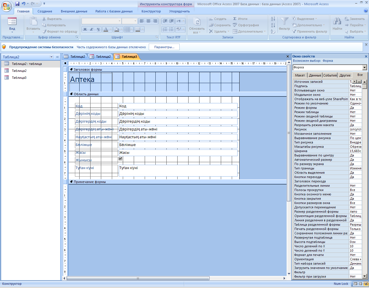 Перейти в режим конструктора форм проще всего щелчком на соответствующей пиктограмме, находящейся в нижней правой части рабочего экрана Ассеss 2007.