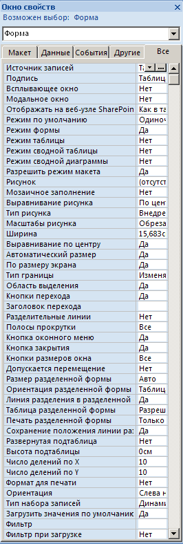 Обратите внимание, что перечень свойств отображается на пяти вкладках для удобства их просмотра. Это связано с огромных количеством свойств, так для формы их насчитывается около сотни. Если вы хотите просматривать свойства одновременно, выберите вкладку Все(рис. 20).