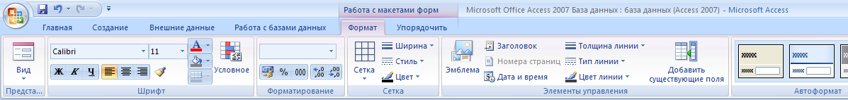 § Режим макета.В этом режиме, предназначенном для пользователей со средним уровнем подготовки, вы получаете возможность изменять свойства полей формы (отображается окно свойств в правой части рабочего экрана), определять формат полей формы (с помощью группы команд Форматирование на вкладке Формат (рис. 21.) — вы можете выбрать также и условное форматирование — как и в Ехсеl 2007), а также изменить макет формы в целом — группа команд Автоформат. Здесь же доступен ограниченный набор элементов управления, которые используются в составе вашей формы.